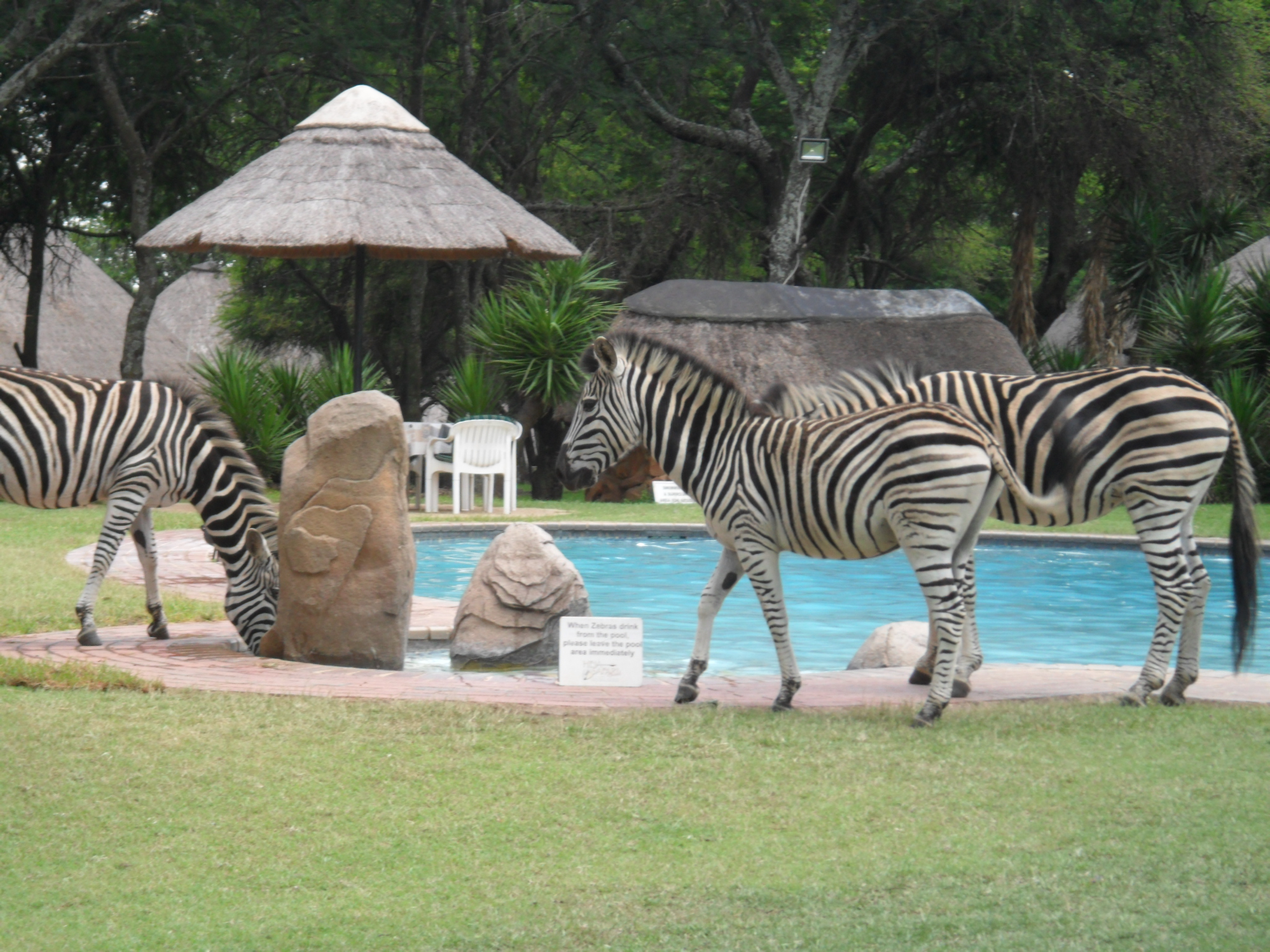 The zebra like to make their way to the swimming pool for a drink. Swimmers have to vacate the pool when the zebras arrive as the safety of the animals is paramount. They cannot be disturbed as, should they be startled, they may slip and injure themselves.