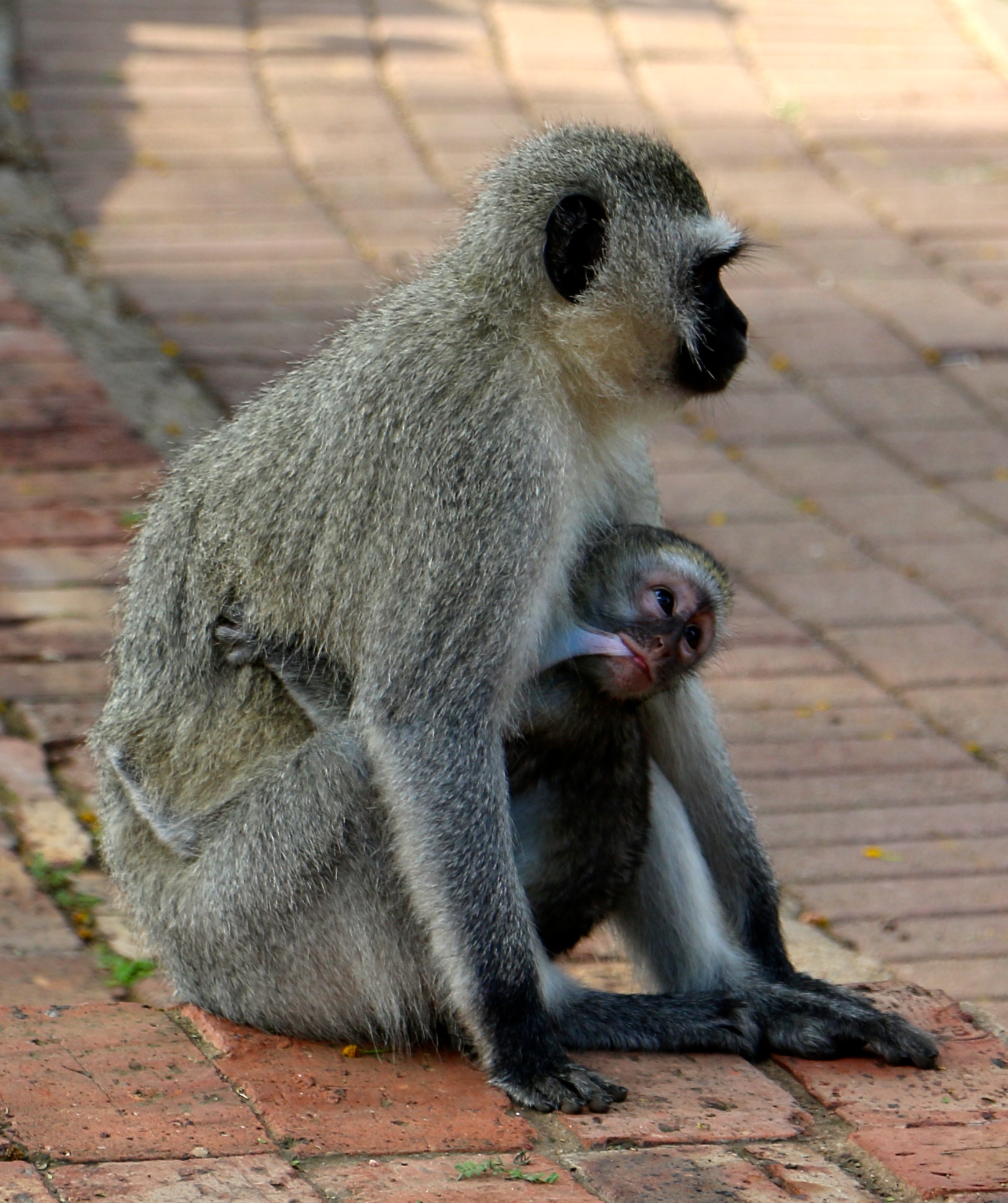 The little monkey’s obviously had enough milk and is “playing with his food”. He’s enjoying the comfort of his mother but monkeys are curious little creatures so he’s also having a look around.